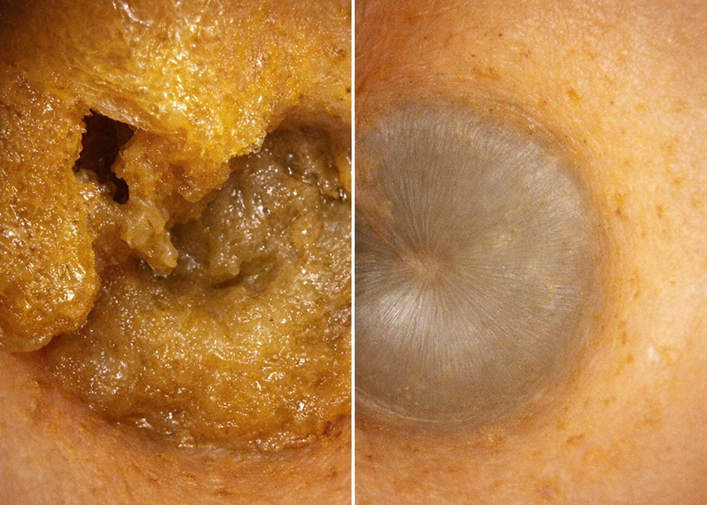 Jest to ilustracja ucha jednego z naszych klientów. Ze względu na ochronę prywatności nie pokazujemy prawdziwego zdjęcia. Żółtawy kolor może oznaczać nagromadzoną woskowinę oraz zanieczyszczenia, które trudno usunąć przy użyciu tradycyjnych metod.